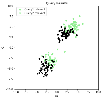 In Figure 1, we have a synthesized dataset containing search results for two queries, very creatively named Query1 and Query2. The result documents have been placed in a feature space of two dimensions, and to keep things simple, weβve limited them to binary labels: a result is either relevant or itβs not. This can be extended to handle labels of varying degrees of relevance without much trouble.